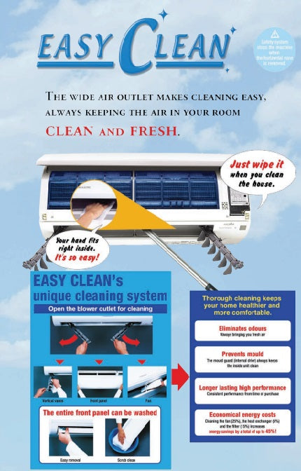 The easily detachable panel is a snap to wash and the airflow vents can be opened without any special tools for quick cleaning of the inside of the air conditioner. It is recommended that the air conditioner be cleaned regularly as this will increase both operating efficiency and energy savings. Always clean the heat exchanger, fan and air vent to ensure proper performance and economical operations.